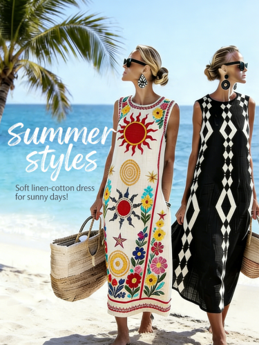 Women's Vintage Fish Art Print Sleeveless Cotton Pocket Wrap Dress