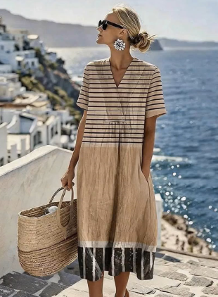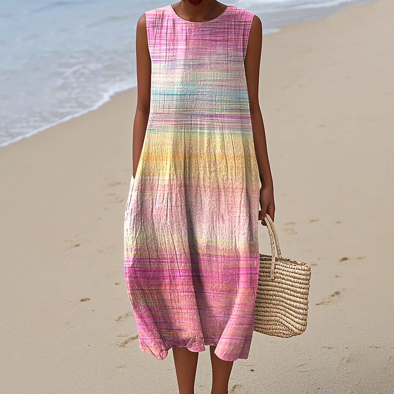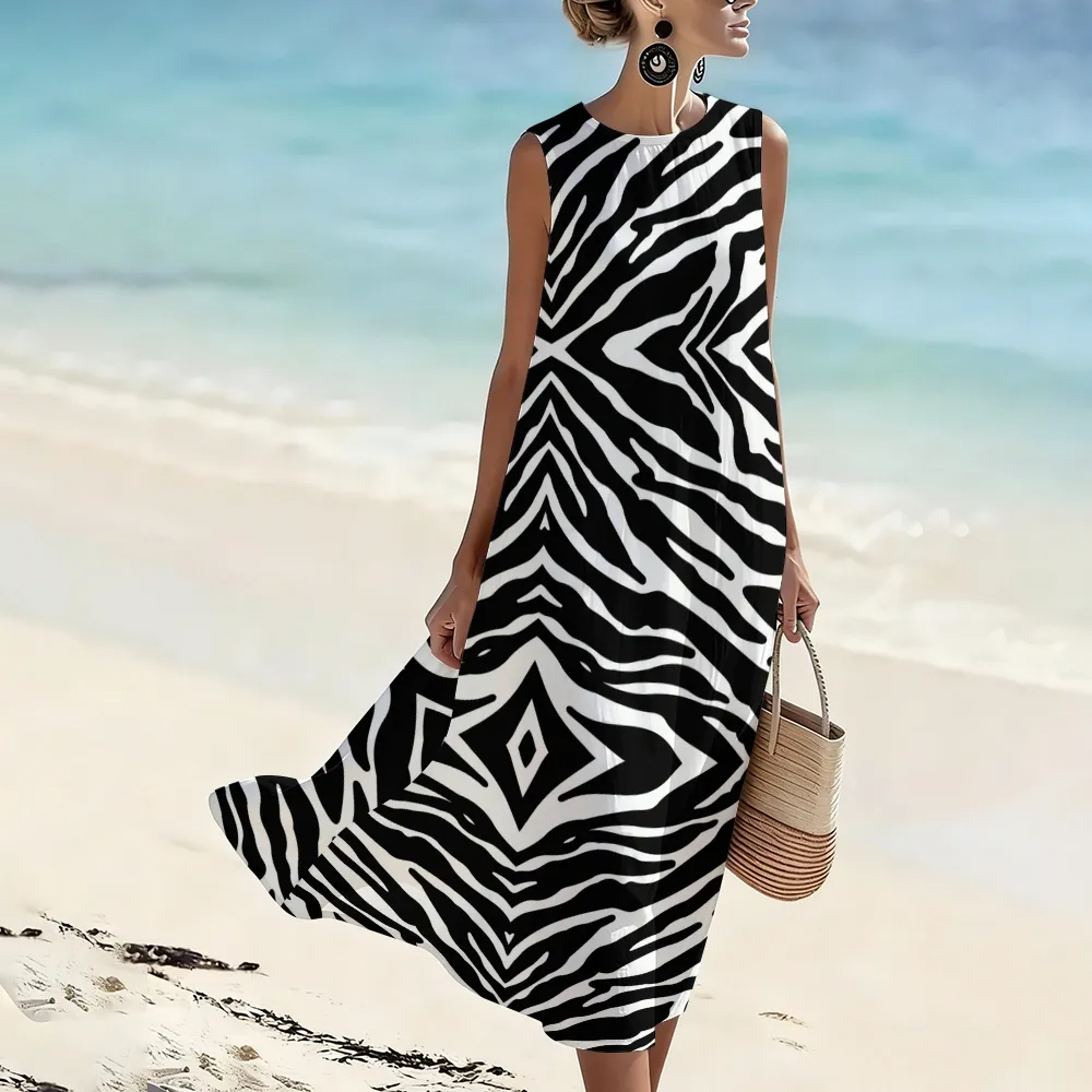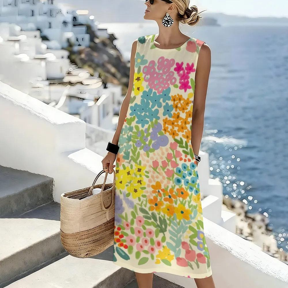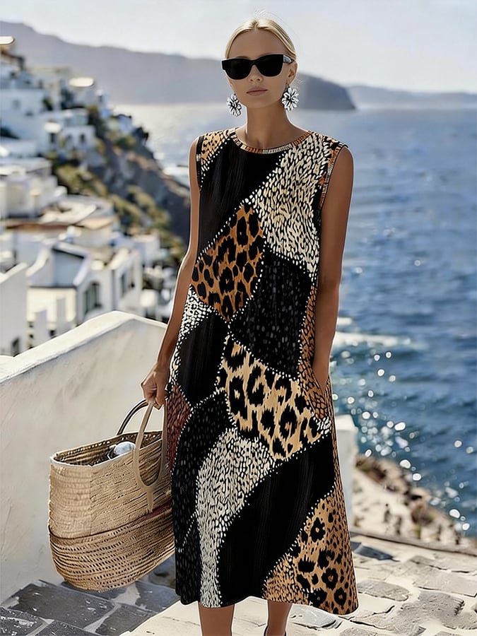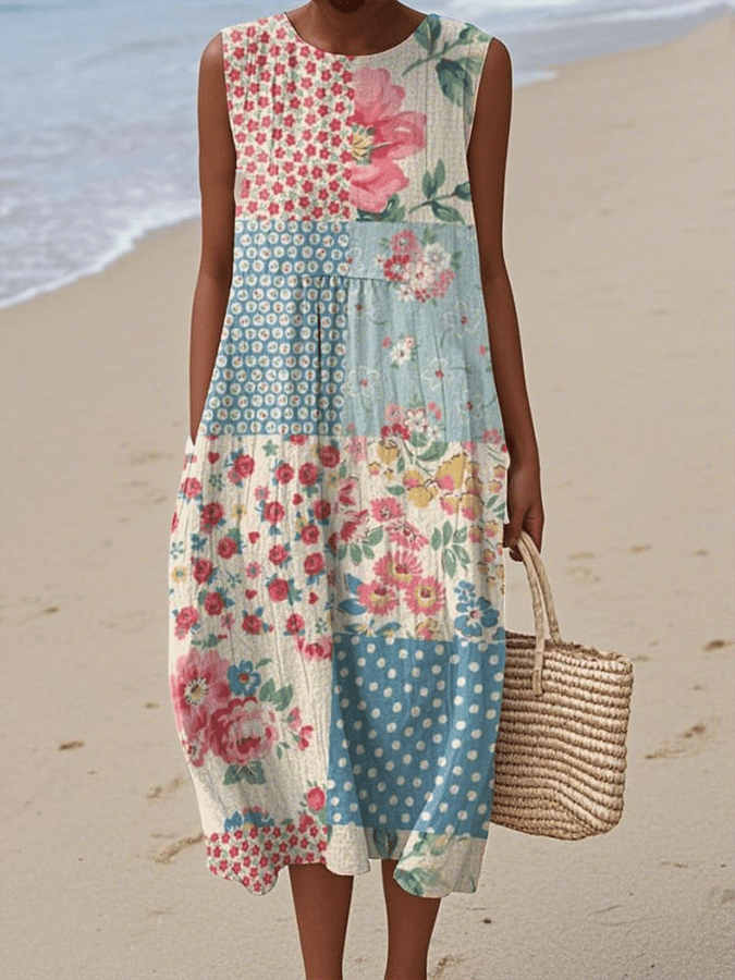 Women'S Round Neck Sleeveless Color-Block Printed Dress