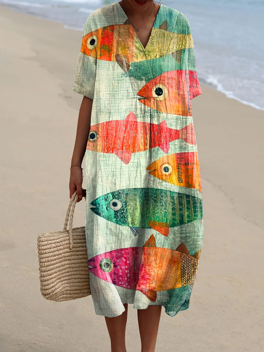 Women's Colorful Fish Art Print Flowy Dress