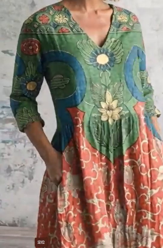 V-neck three-quarter sleeve retro print shirt