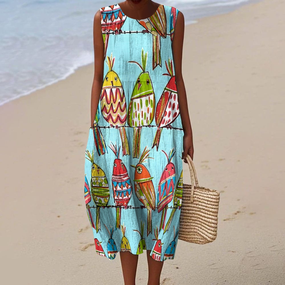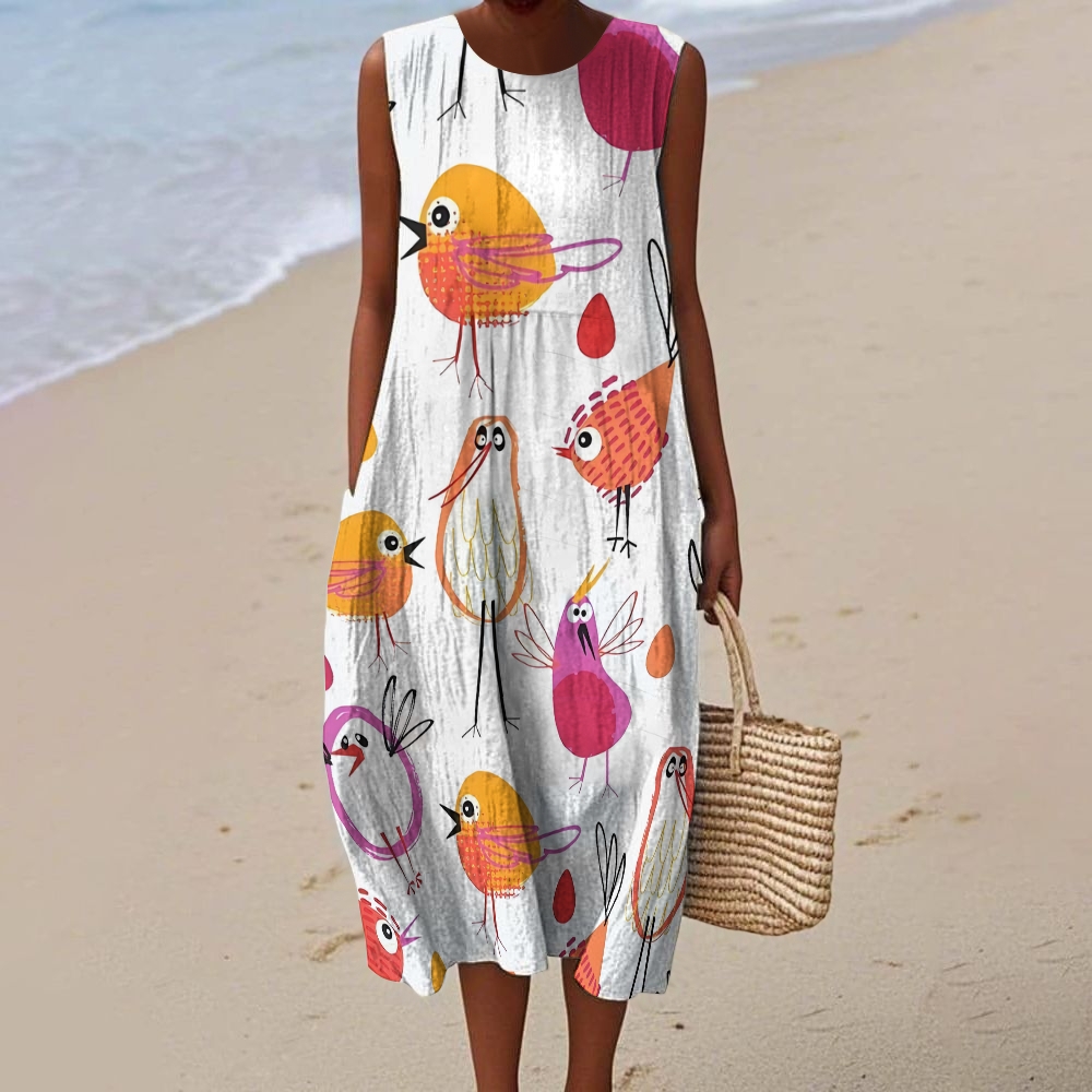 Cute Chick Print Sleeveless Cotton Pocket Wrap Dress for Women