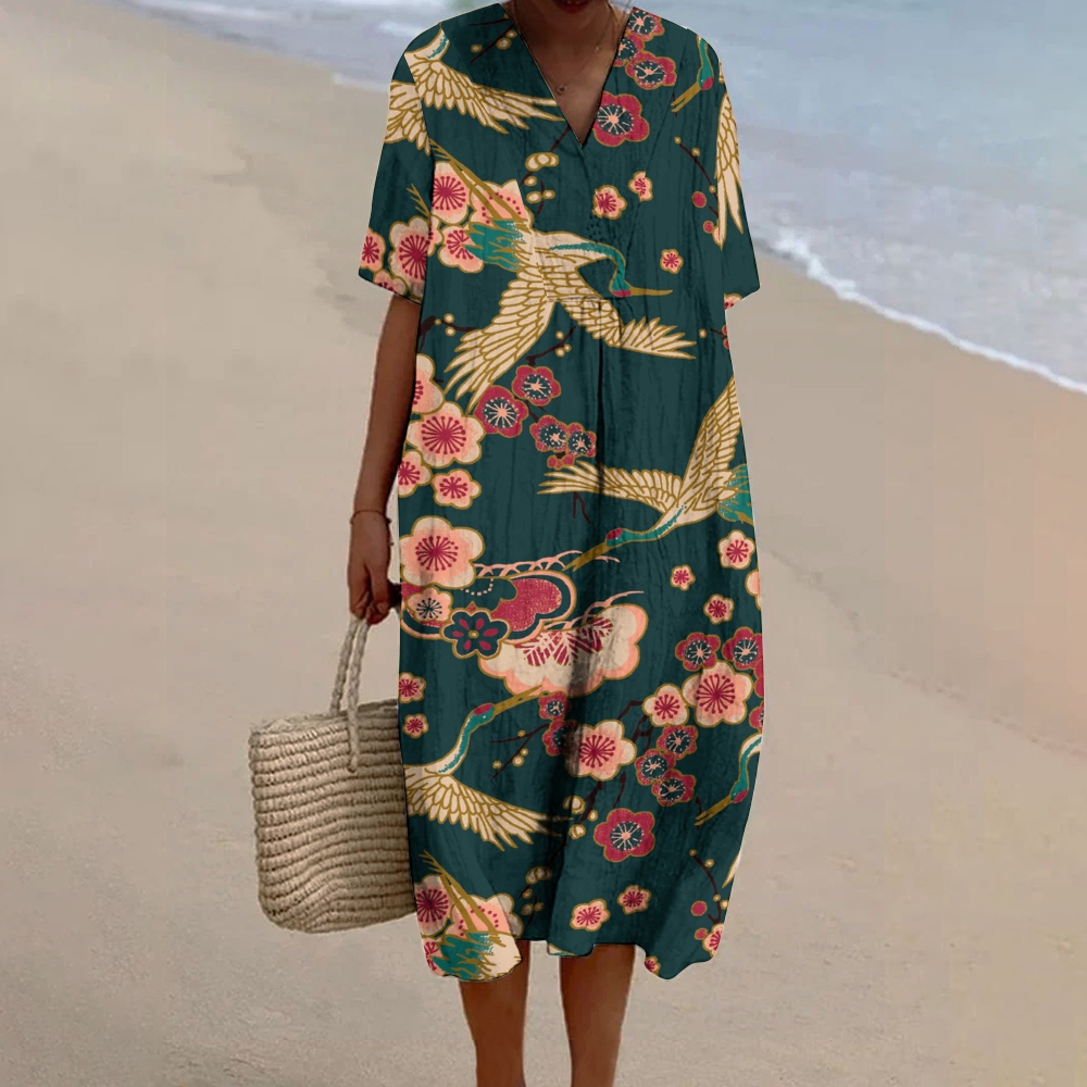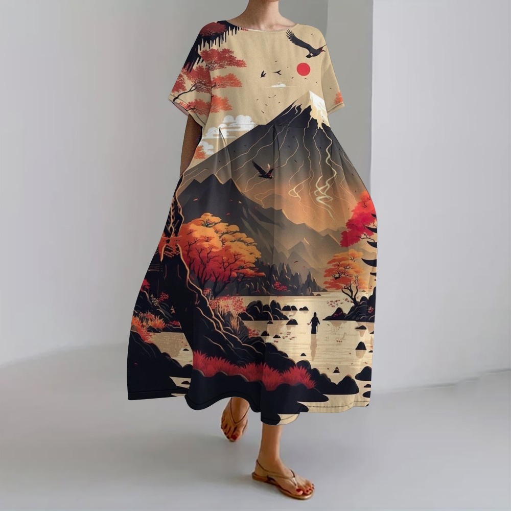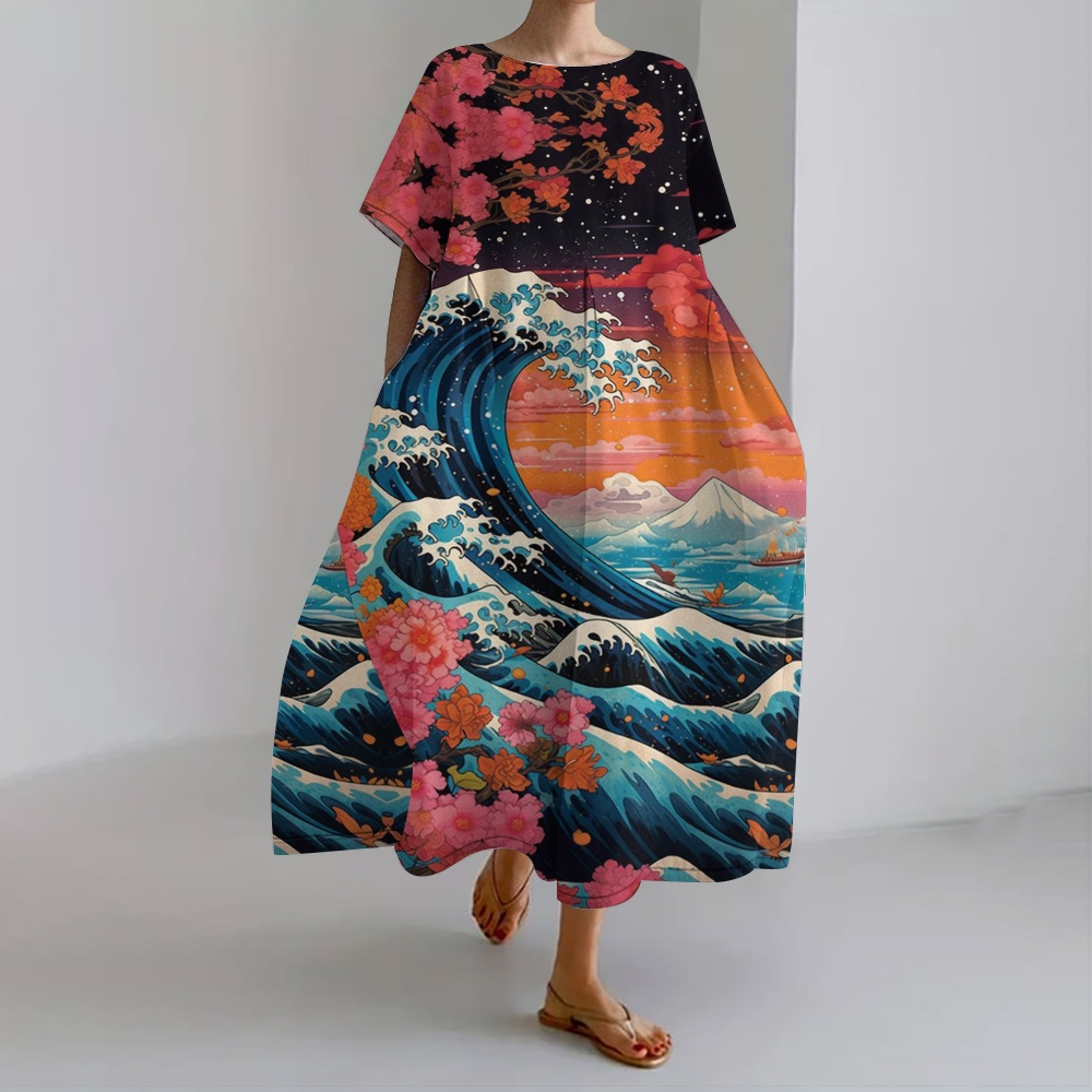 Wave Floral Japanese Art Loose Short Sleeved Midi Dress