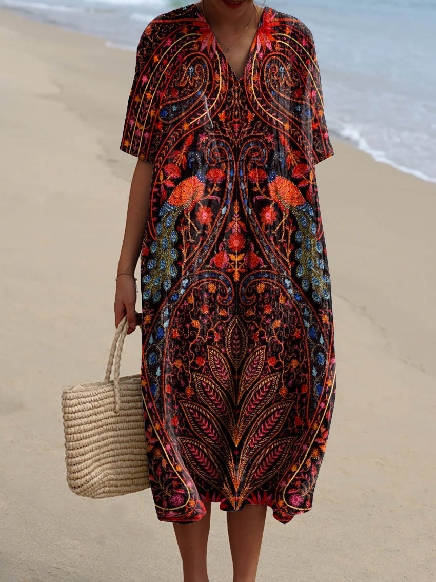 Women's Vintage Floral Peacock Pattern Art Print Flowy Cotton Dress