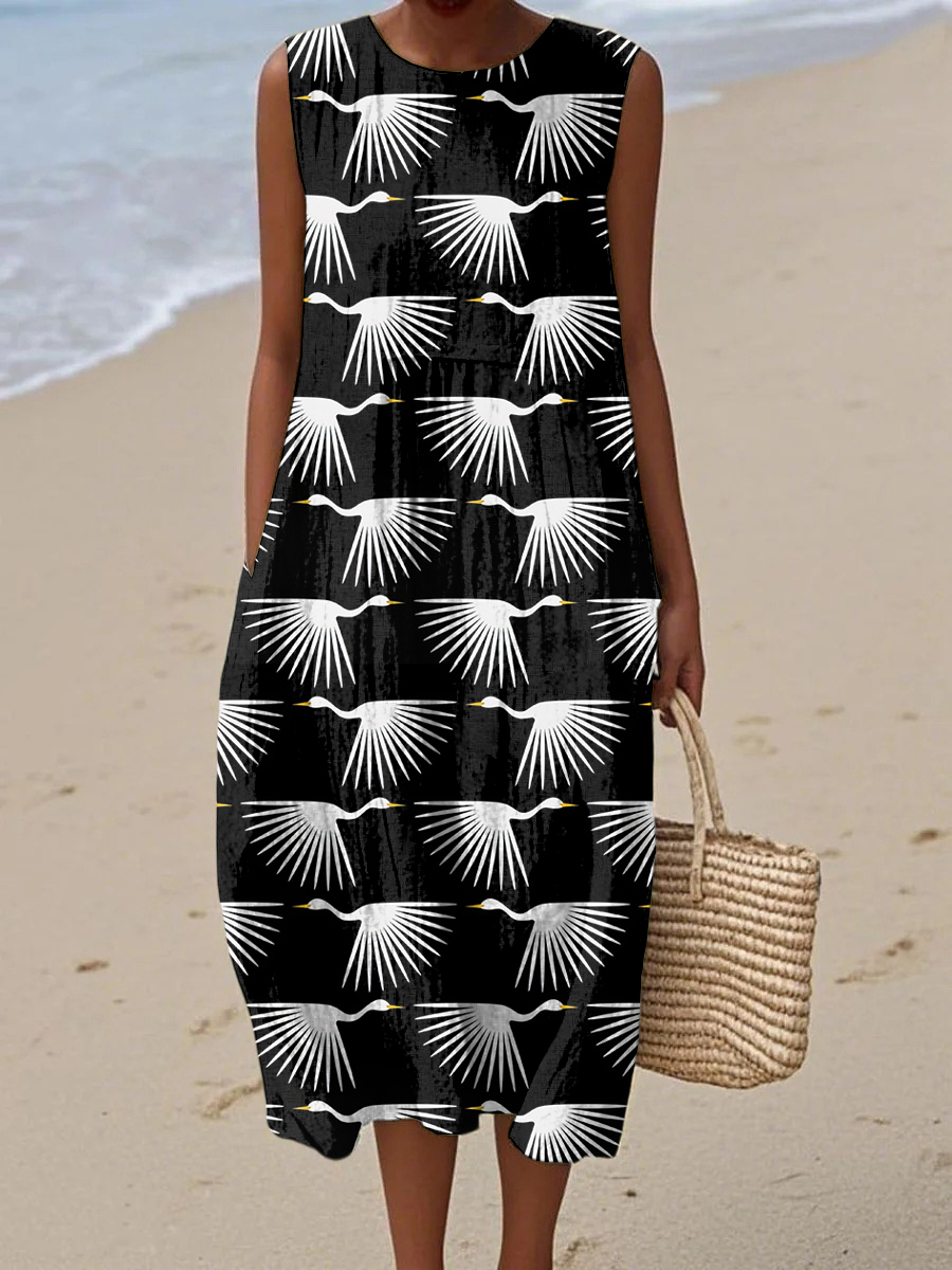 Women's Flying Crane Japanese Art Print Sleeveless Linen Pocket Wrap Dress