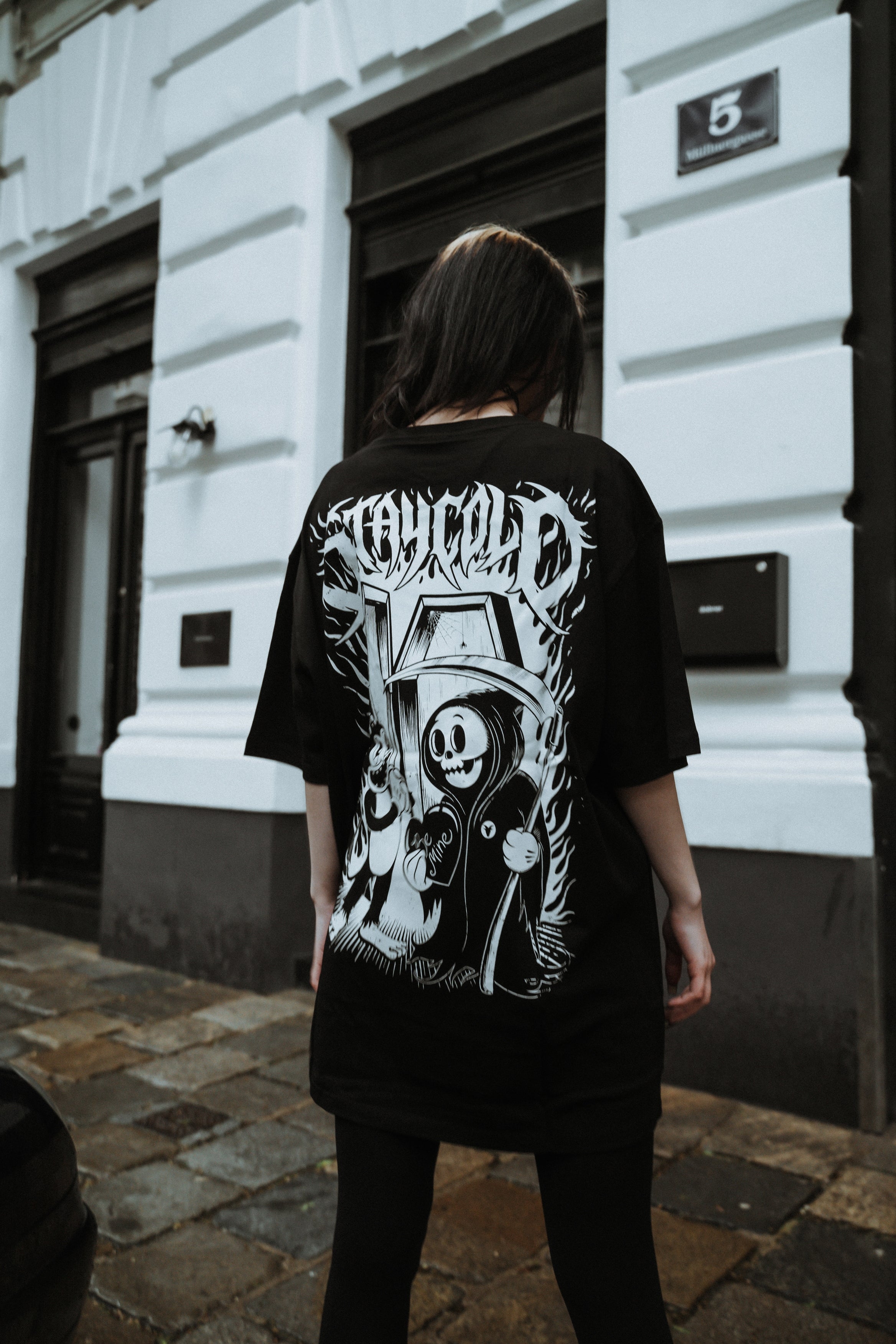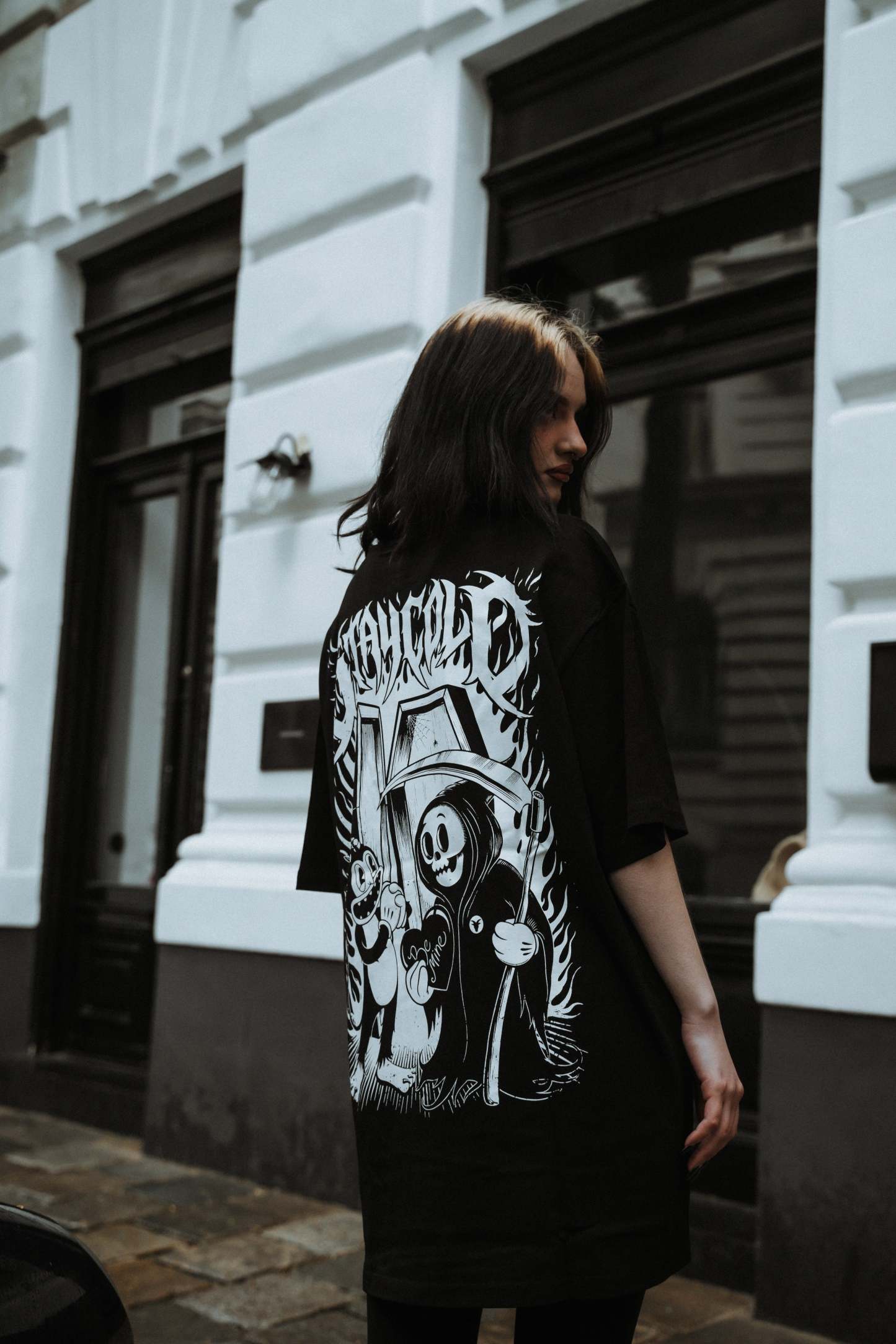 Snatch some hearts with the effortlessly cool „Be Mine“ design that we created together with bro_oks_art. This black T-Shirt is a standout piece, showcasing Bro_oks_art‘s signature blend of fun and devilish comic style. Imagine this: a mischievous reaper, craftily enticing unsuspecting victims into a pre-prepared coffin.