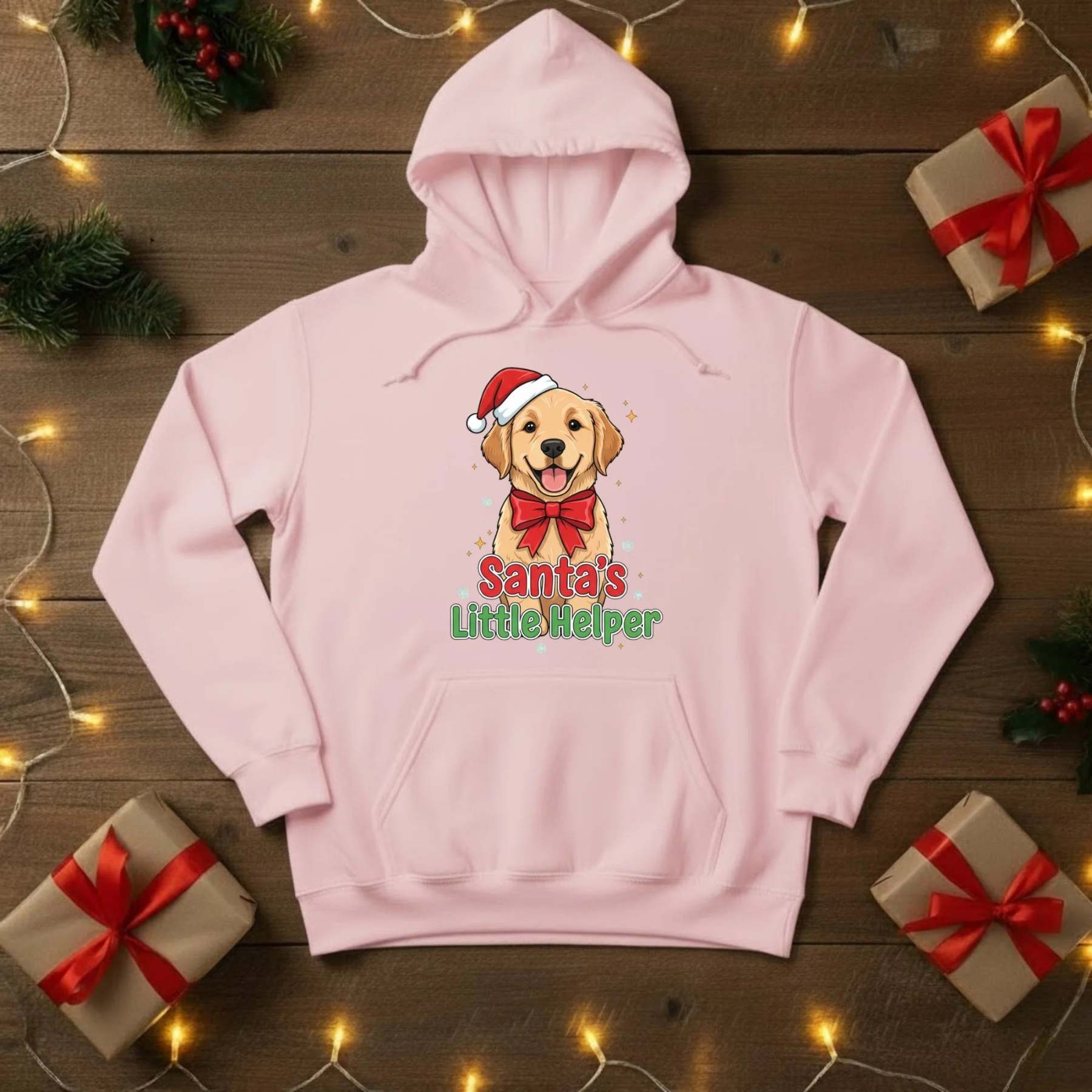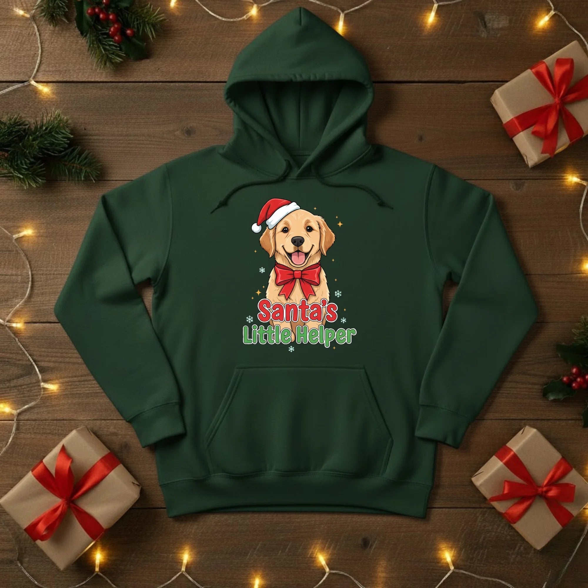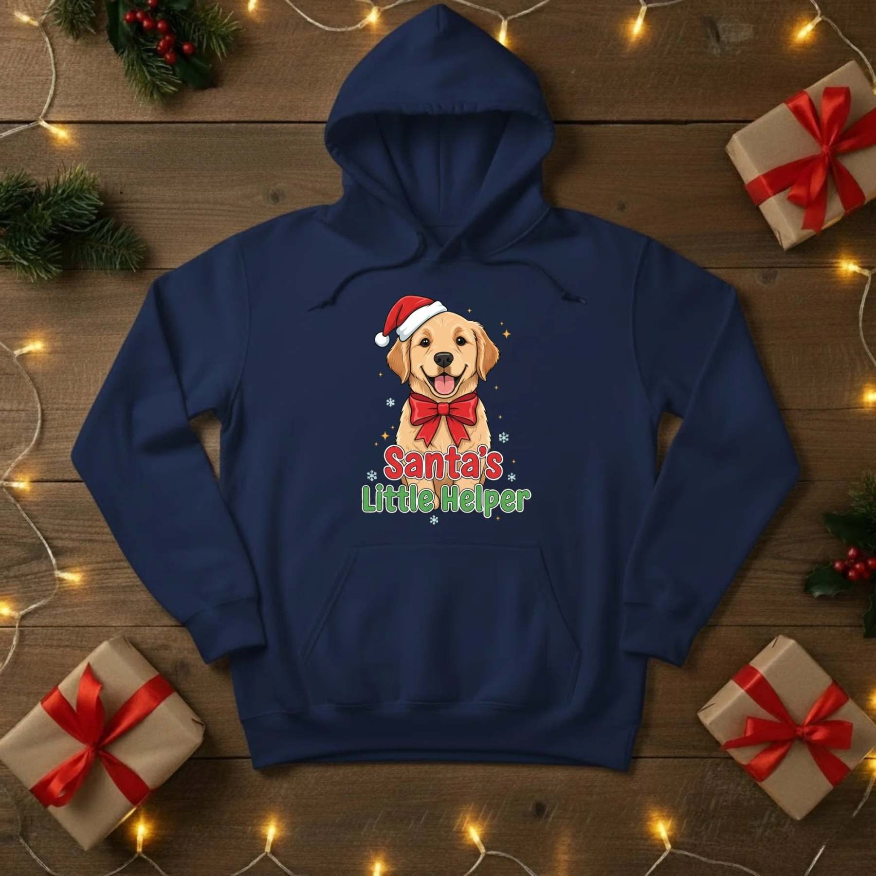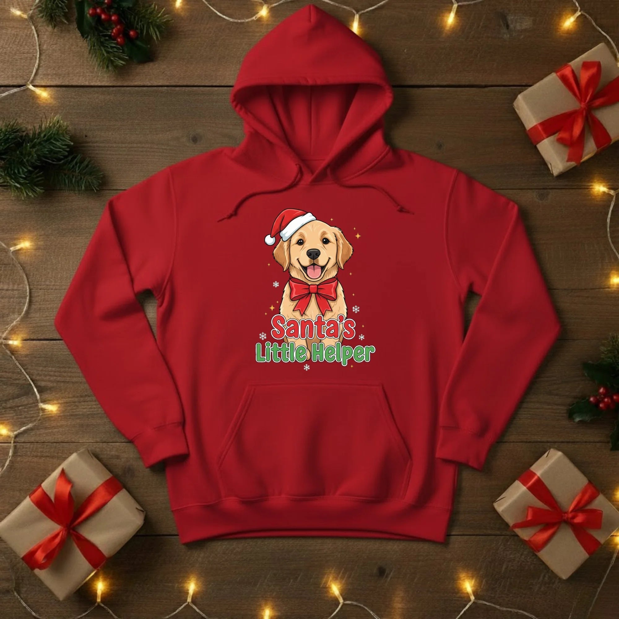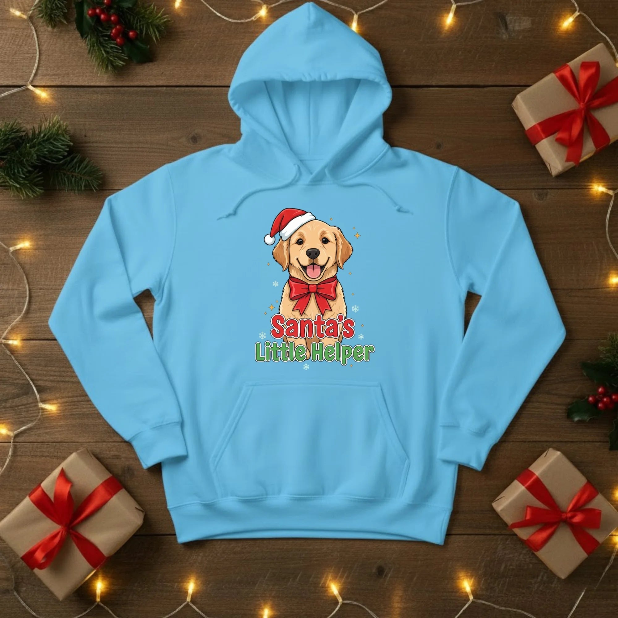 Spread some festive cheer with our Santa’s Little Helper Christmas Hoodie — the perfect pick for dog lovers and holiday enthusiasts alike! Featuring an adorable pup in a Santa hat and bow, this cosy hoodie brings a playful touch to your winter wardrobe. Ideal for Christmas parties, gift exchanges, or simply lounging with a cup of hot chocolate by the fire.