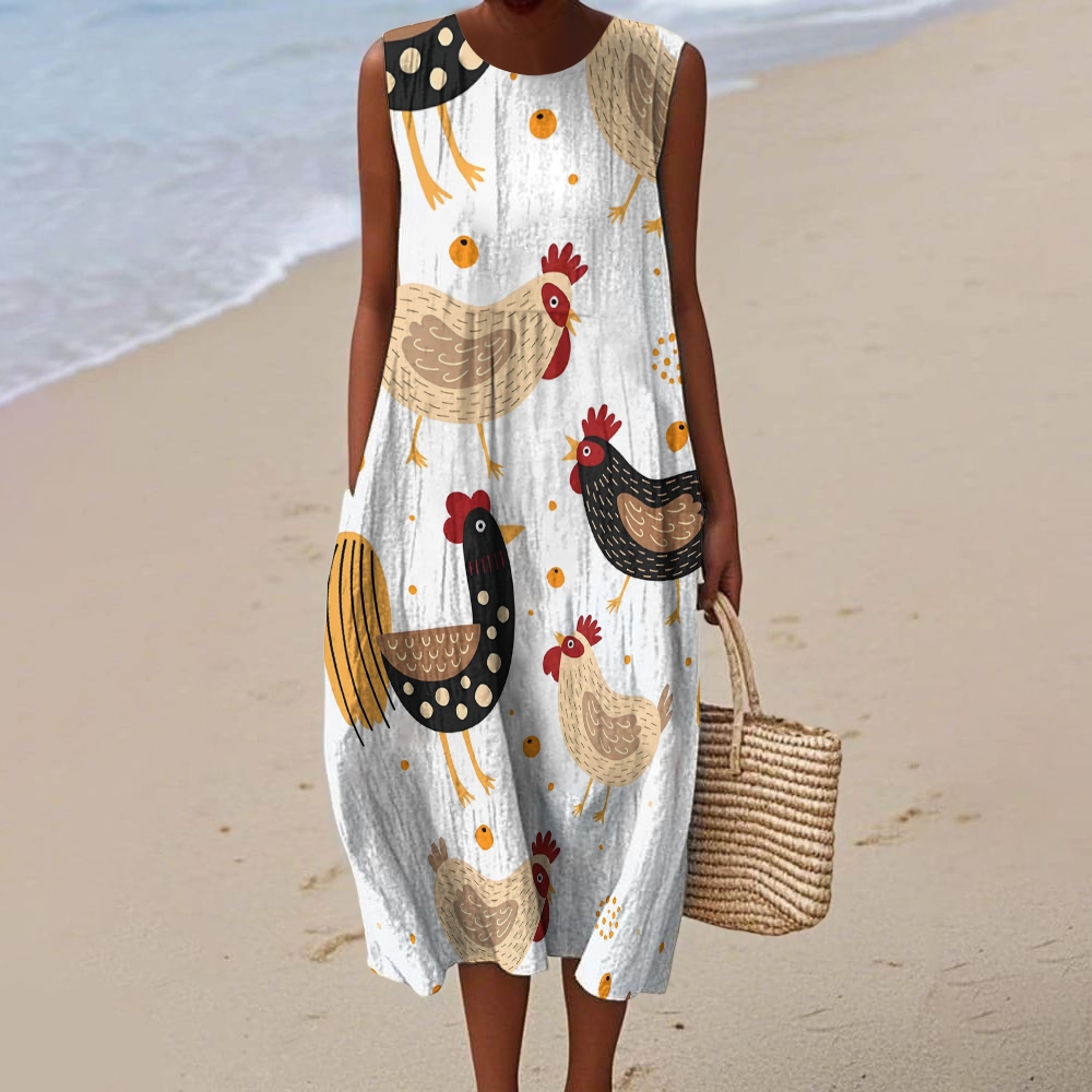 Cute Chick Print Sleeveless Cotton Pocket Wrap Dress for Women