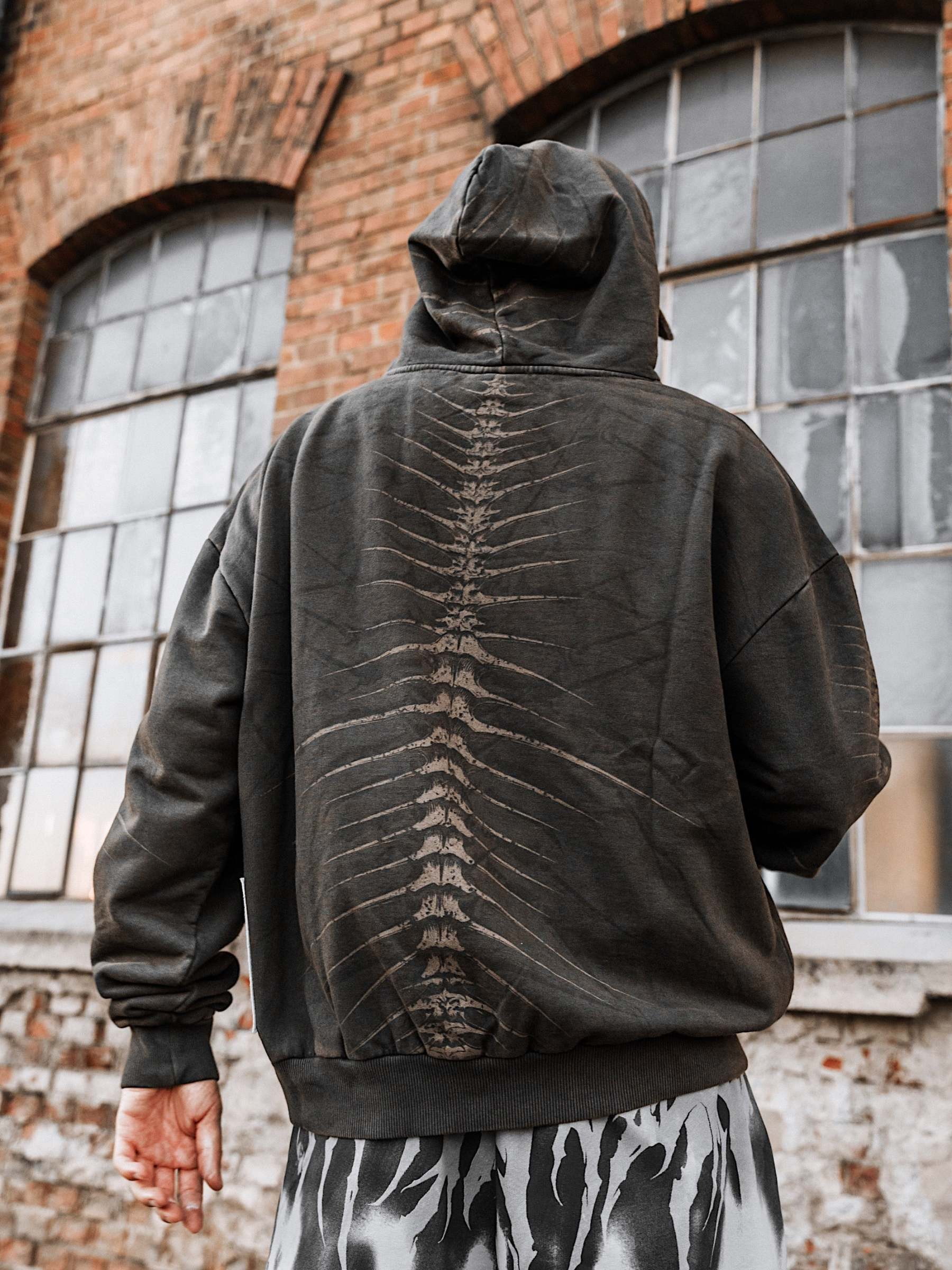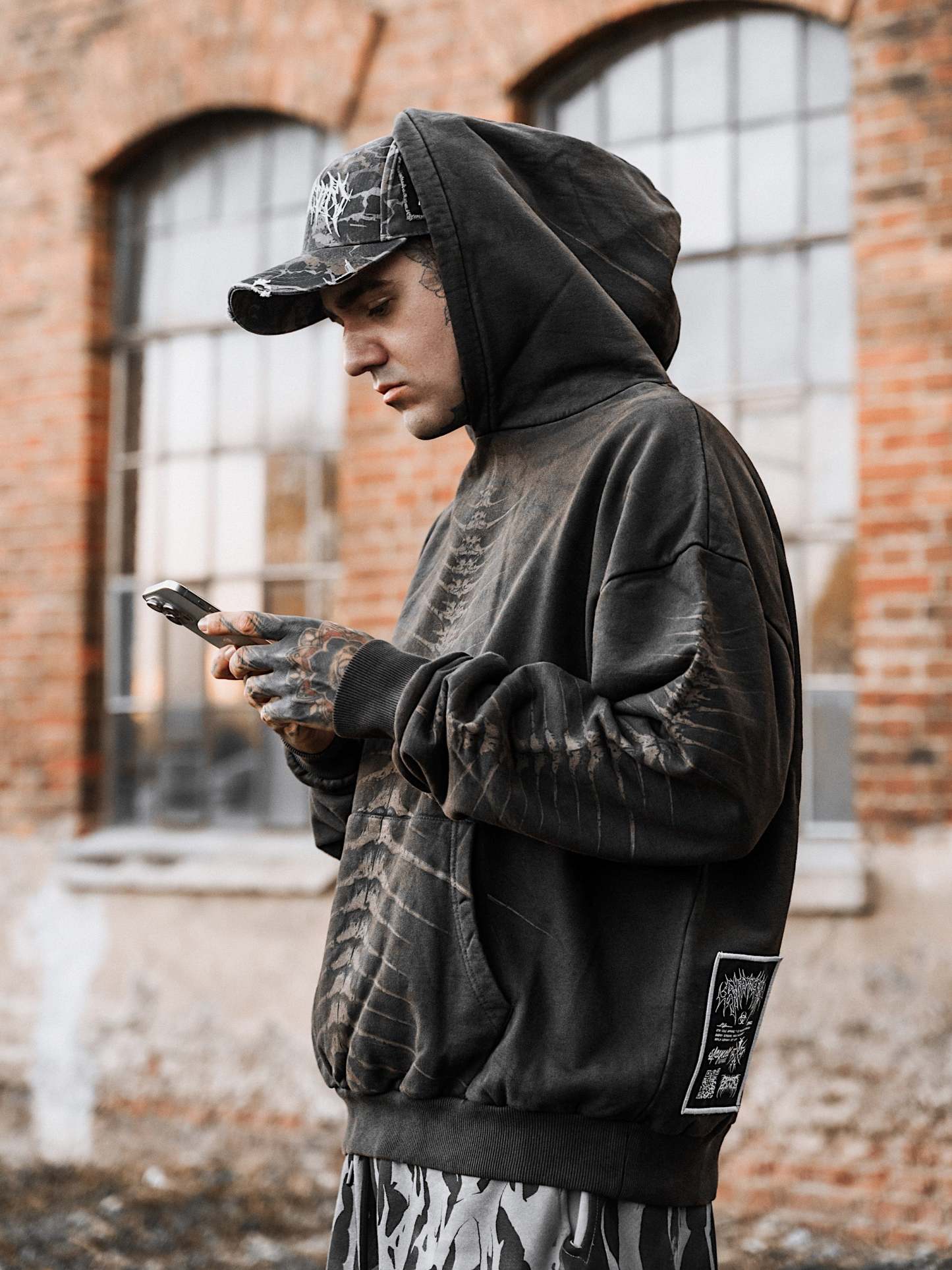 Crafted and built with a heavyweight 400GSM fabric, this hoodie doesn’t just keep you warm - it commands attention. The acid-washed finish creates a raw, otherworldly vibe, while the massive all-over discharged prints feel like a story ripped straight from the edge of reality. A custom woven patch with razor-sharp edges adds a sleek touch of precision to the chaos.
