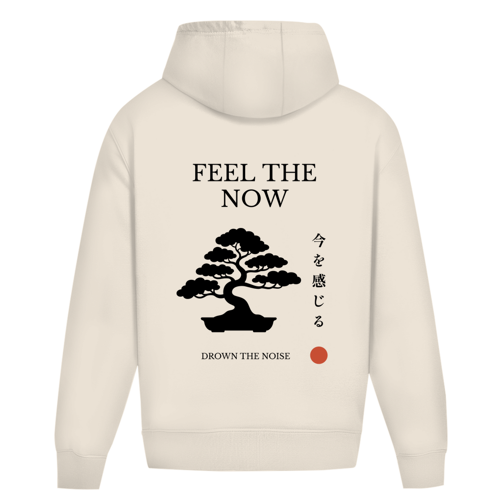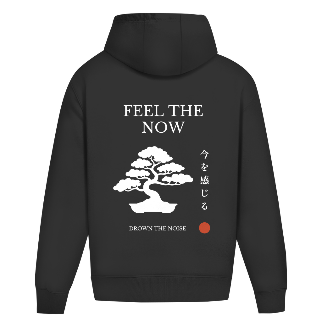-Backprint: Bonsai-Silhouette mit „Feel the Now“-Schriftzug