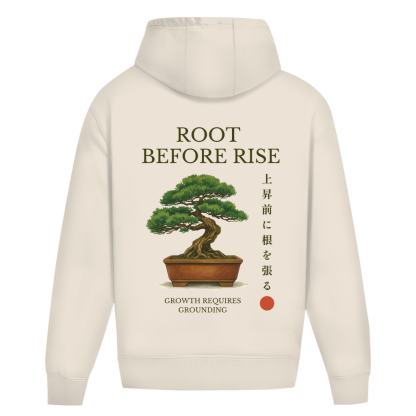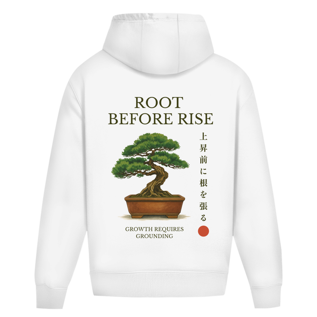-Backprint: Moyogi-Bonsai mit „Root Before Rise“-Schriftzug