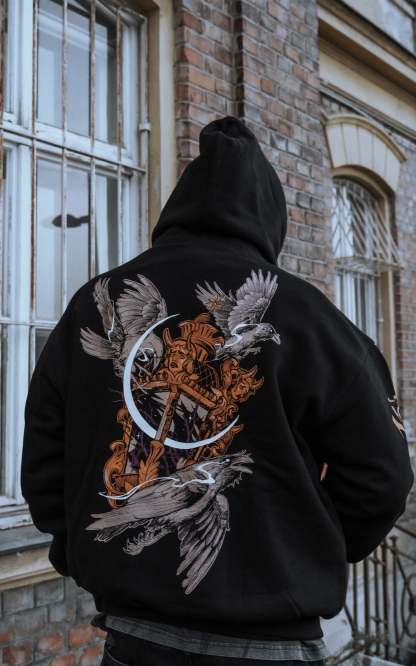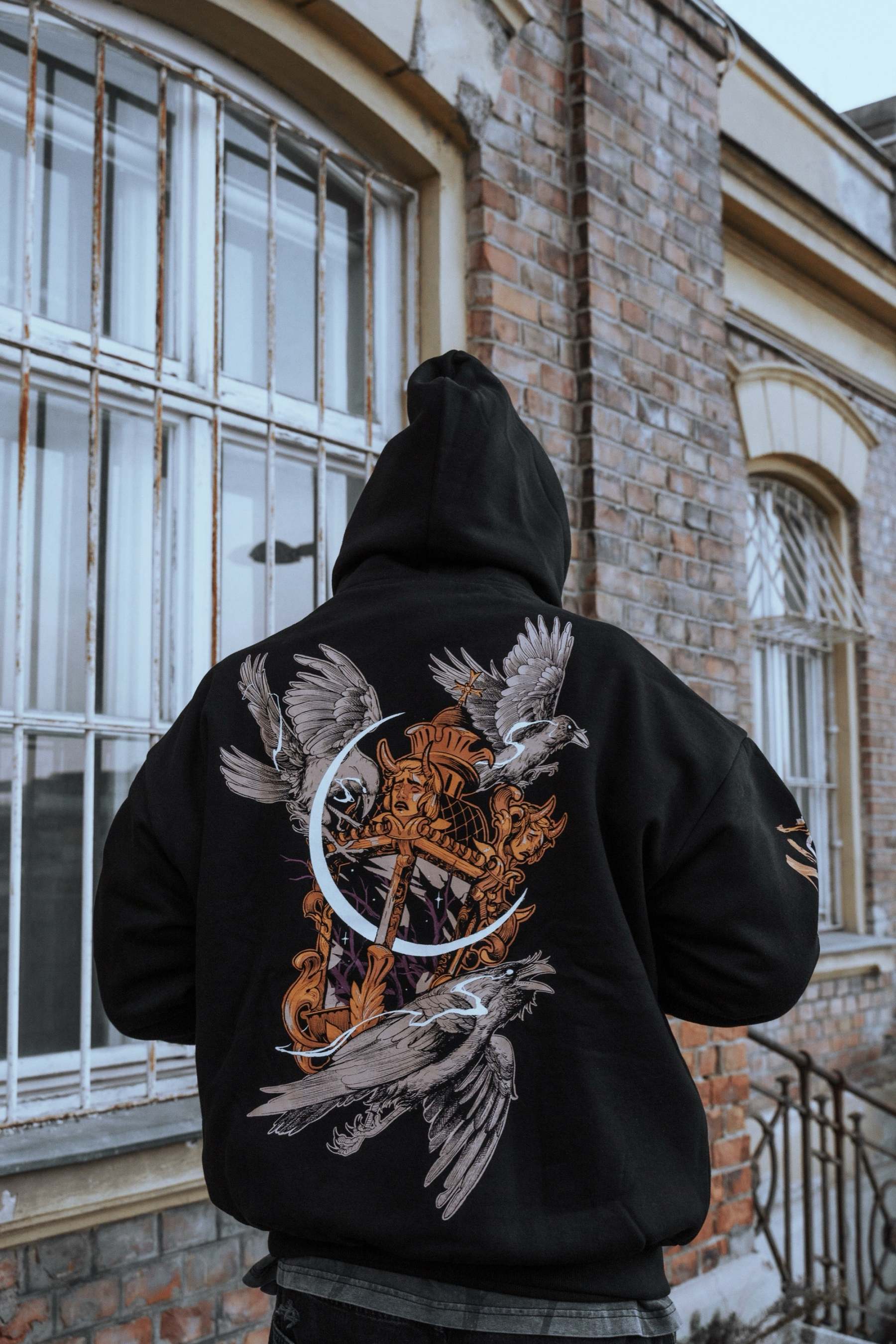 This artwork is a celestial fusion of ethereal elements – a lantern, delicately embracing a glowing crescent moon within, surrounded by three enigmatic ravens and a fitting sleeve print that tops the design off.