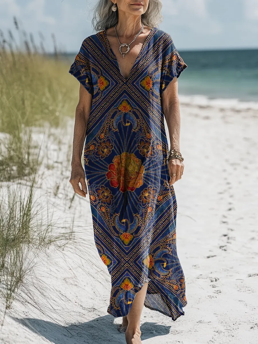 Women's Floral Art Print Casual Cotton And Linen Dress